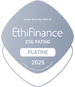 Depuis 2020, la Société de la Tour Eiffel fait partie du classement Ethifinance ESG Rating (ex Gaïa Rating) qui permet de situer les entreprises sur la base de leur niveau de transparence et de performance extra-financière, évalué sur trois ans. La Société a obtenu le badge Platine en 2025 dans la catégorie PME-ETI cotées dont le chiffre d’affaires est inférieur à 150 M€. Gouvernance, volet social, pilier environnement, relations avec les parties prenantes externes : la notation révèle une évolution constante de la foncière sur chacun des aspects soumis à évaluation sur les trois années examinées, bel indicateur de la pertinence du plan d’action RSE.